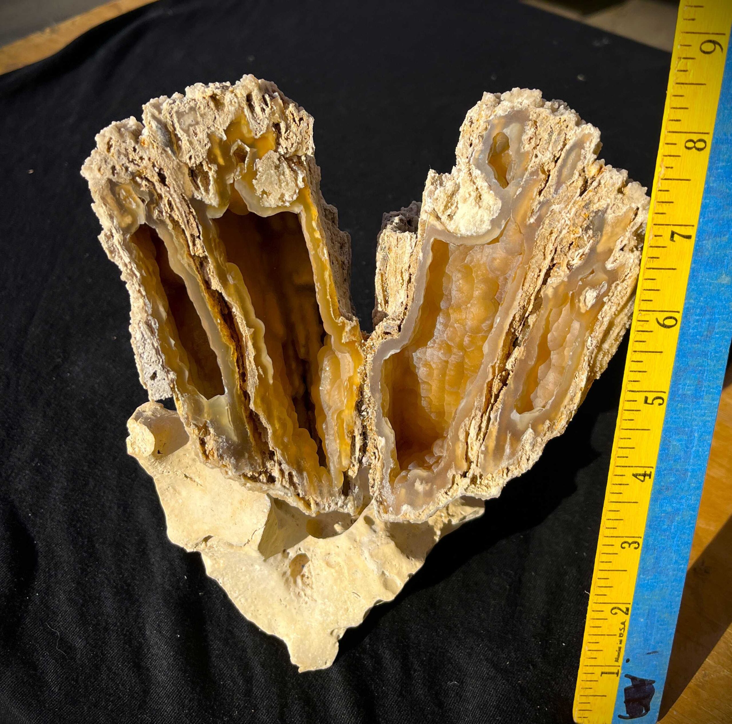 NOTE: Unusual piece with preserved coral structures. Cut and polished face. An attractive and informative display card accompanies the specimen.