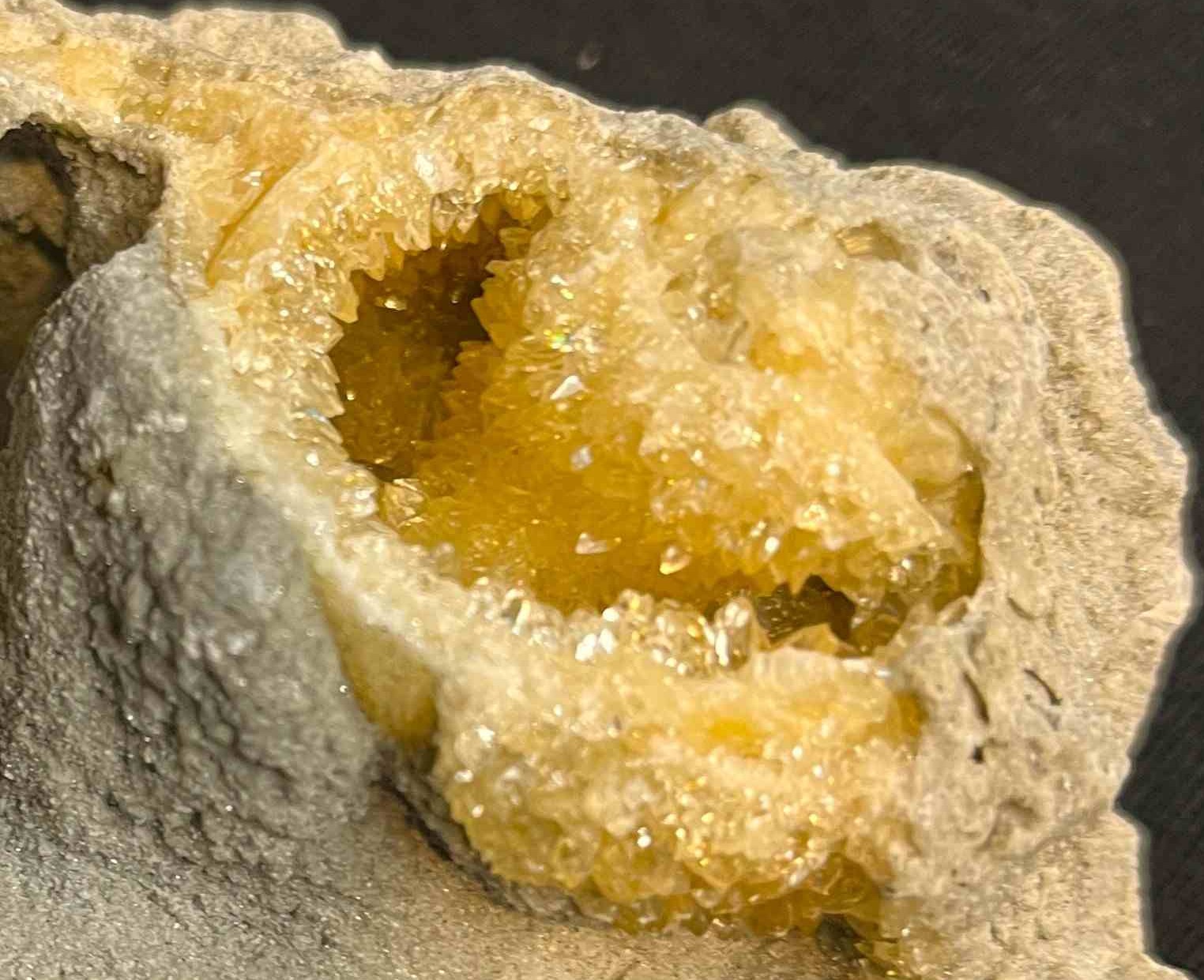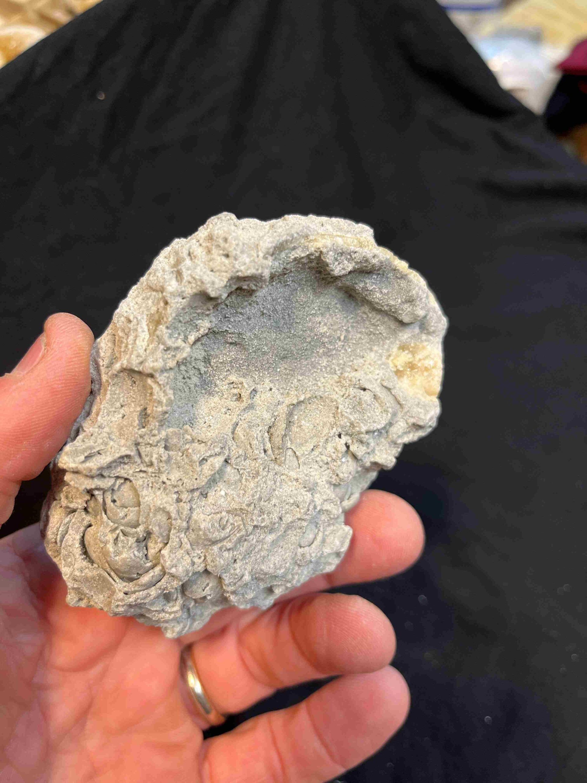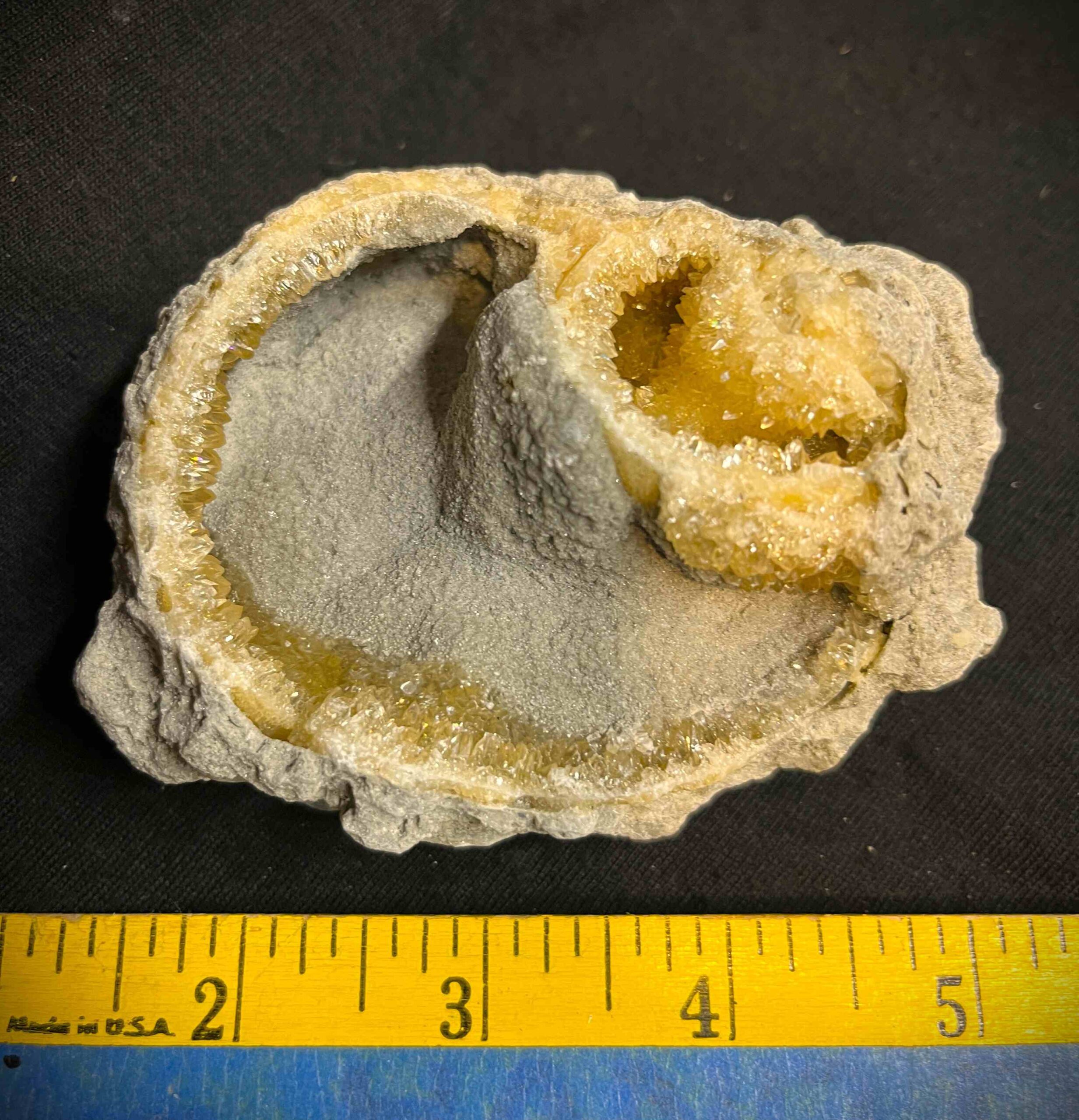 Notes specific to this specimen: Fossil welks are much rarer than the clams found at Rucks Pit and most of them have no crystals. But, when you do find a nice crystal-line specimen, there’s nothing like it in the world! This is a single welk with a natural opening on its dorsal (top) allowing you to see the crystal lining of the shell and the gray sparite “floor” that was the sediment which partially filled the shell after the animal had died. Very unusual.